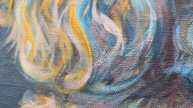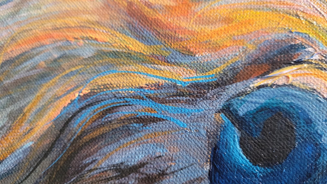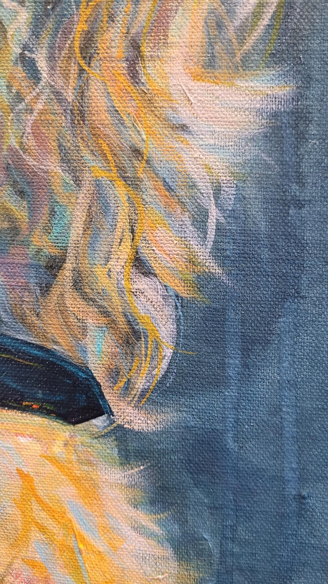 Charlie, the cockapoodle painted with blues and oranges in professional acrylics.